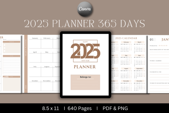 – Welcome Page – 2025 Calender – Year at Glance – Yearly Planner – Monthly Inspirational Quotes – Monthly Planner – Monthly Review – Weekly Reflections – Weekly Planner – Daily Planner – Notes – 640 pages Ready PDF File – PNG File – Editable Canva Template Link – PowerPoint File – 8.5×11 in File (Bleed)